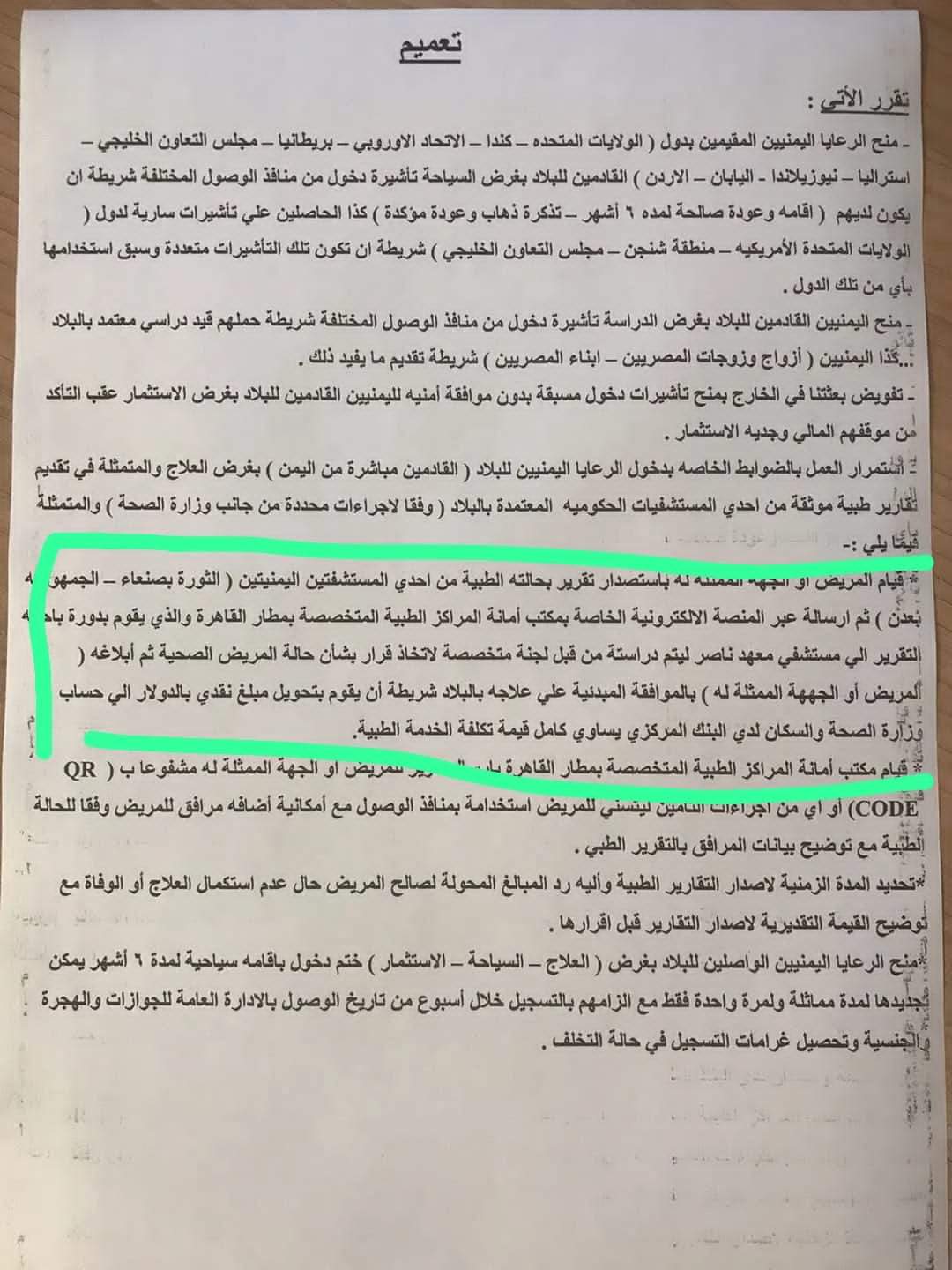 الخميس 7/9/2023، أعلنت الحكومة المصرية عدد من القرارات، والتي اعتبرتها نوع من التسهيللات لليمنيين، بحكم الأوضاع التي يمر بها بسبب الحرب المستمرة، منذ انقلاب الحوثيين في 2014 على الحكومة اليمنية. حيث لاقت هذه القرارت عدد من الانتقادات من قبل اليمنيين وخصوصاً،ما يتعلق باليمنيين في الداخل والذي يقصدون مصر للعلاج ومن أبرز الشروط التي عبروا استياهم عنها: